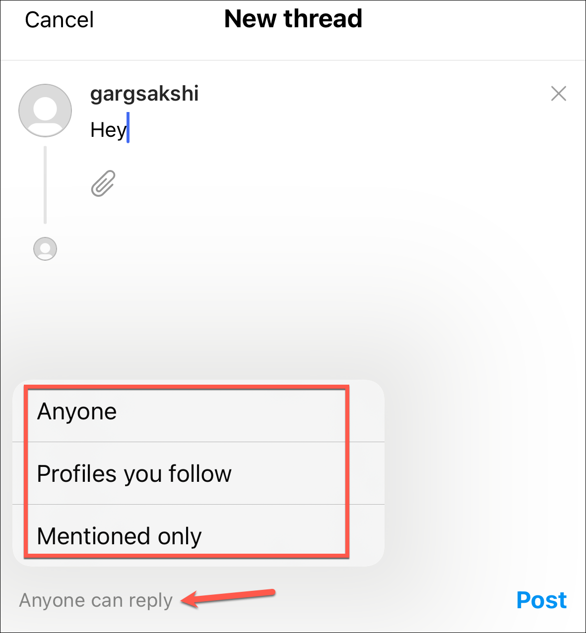 Choose the audience that can reply to your thread by tapping the 'Anyone/ Your followers can reply' option. (Depending on whether your profile is public or private, the option will be different.) Then, choose from 'Anyone/Your followers', 'Profiles you follow', and 'Mentioned only'.