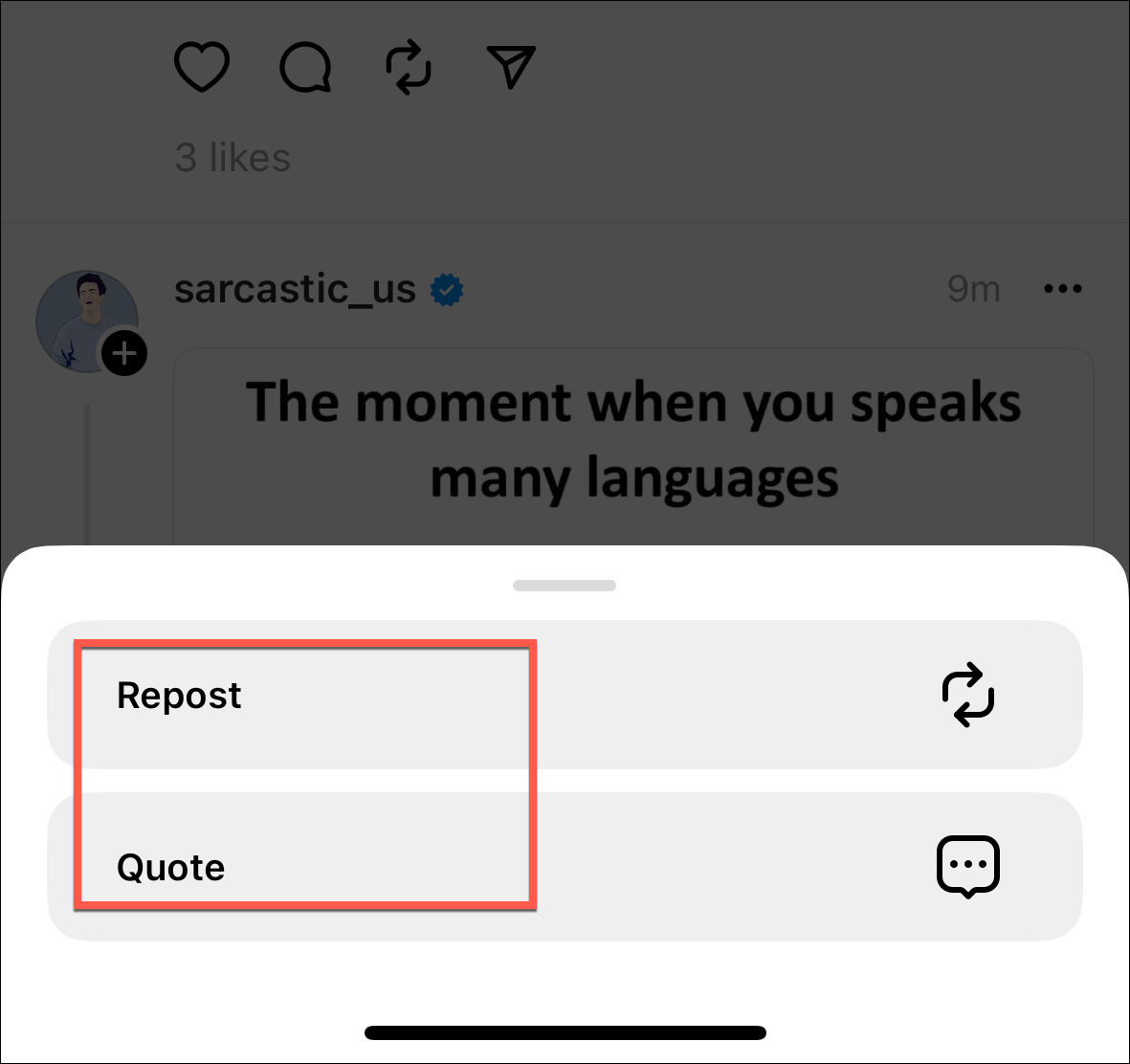 The Repost button allows you to choose from two options: 'Repost' and 'Quote'; the former reposts the thread on your Profile as it is, while the latter allows you to add your two cents to the thread before posting it.