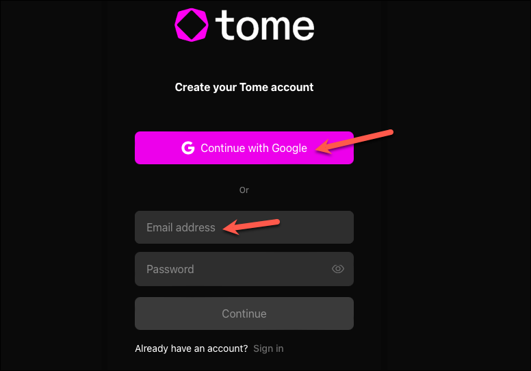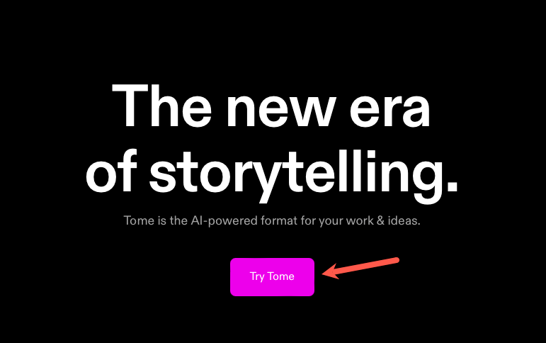 To get started, navigate to tome.app and click the 'Try Tome' button.