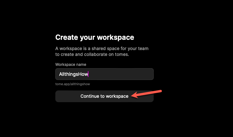 Then, enter the name for your Workspace and click 'Continue to Workspace'. A workspace is a shared space where you can collaborate on tomes by adding team members. The name that you enter for the Workspace will become a part of its URL, so choose accordingly.