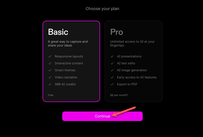 Choose your Tome plan and click 'Continue'. If you chose Pro, complete the purchase. For Basic users, Tome will be set up and ready to use right away.