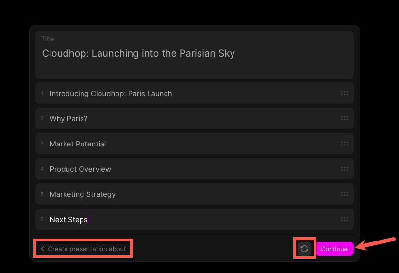 It will generate an outline for the presentation. You can make any changes to the outline or click the 'Regenerate' button to get a new outline. You can also go back and enter a different prompt. But, if you want to generate the presentation, click on the 'Continue' button to proceed.