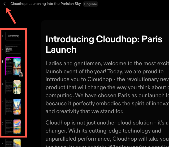 You can navigate between different slides using the 'left' < and 'right' > arrows or by clicking the slide number from the pane on the left. You can also rearrange the slides by dragging them up or down. You can also go back to your Tome workspace by clicking the 'back arrow <' in the top left corner.