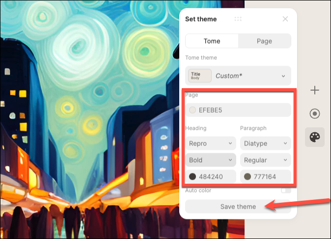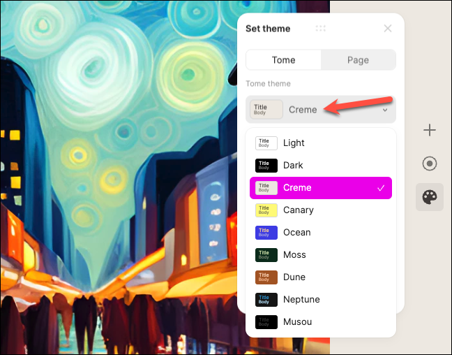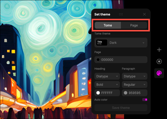 You can change the theme of the entire presentation or the current page. Switch between the 'Tome' and 'Page' tabs and make the changes.