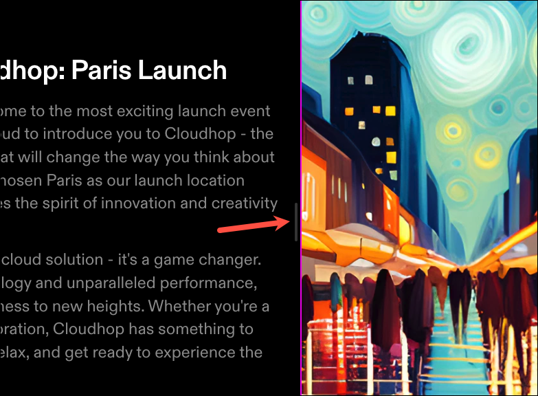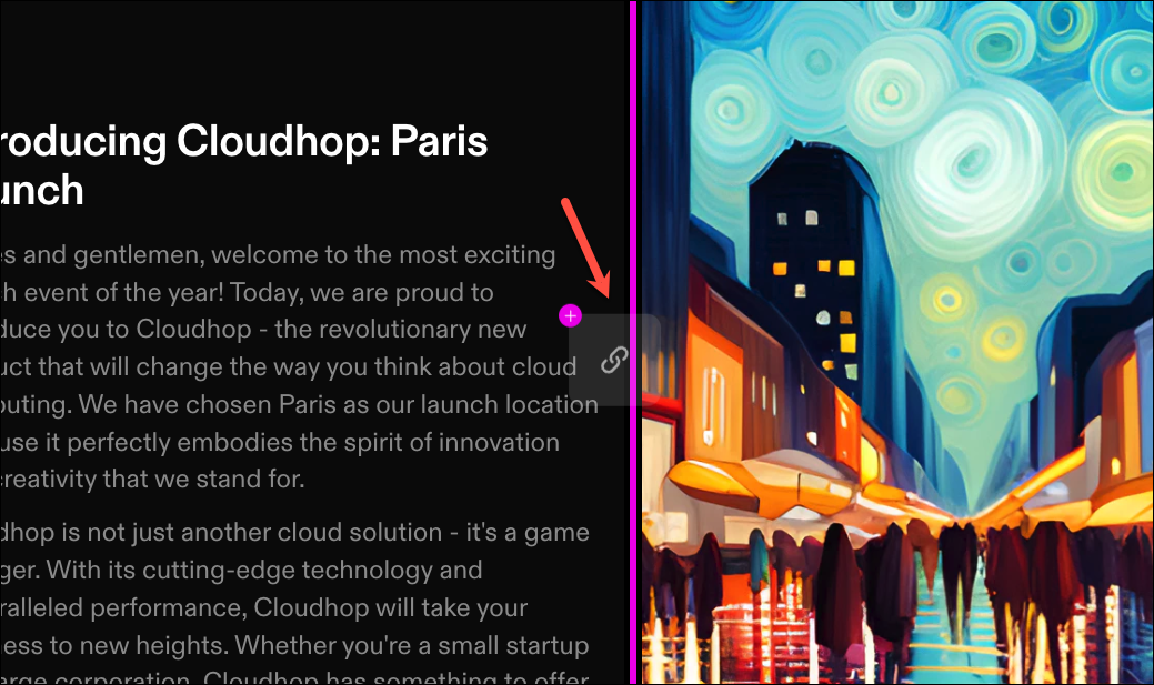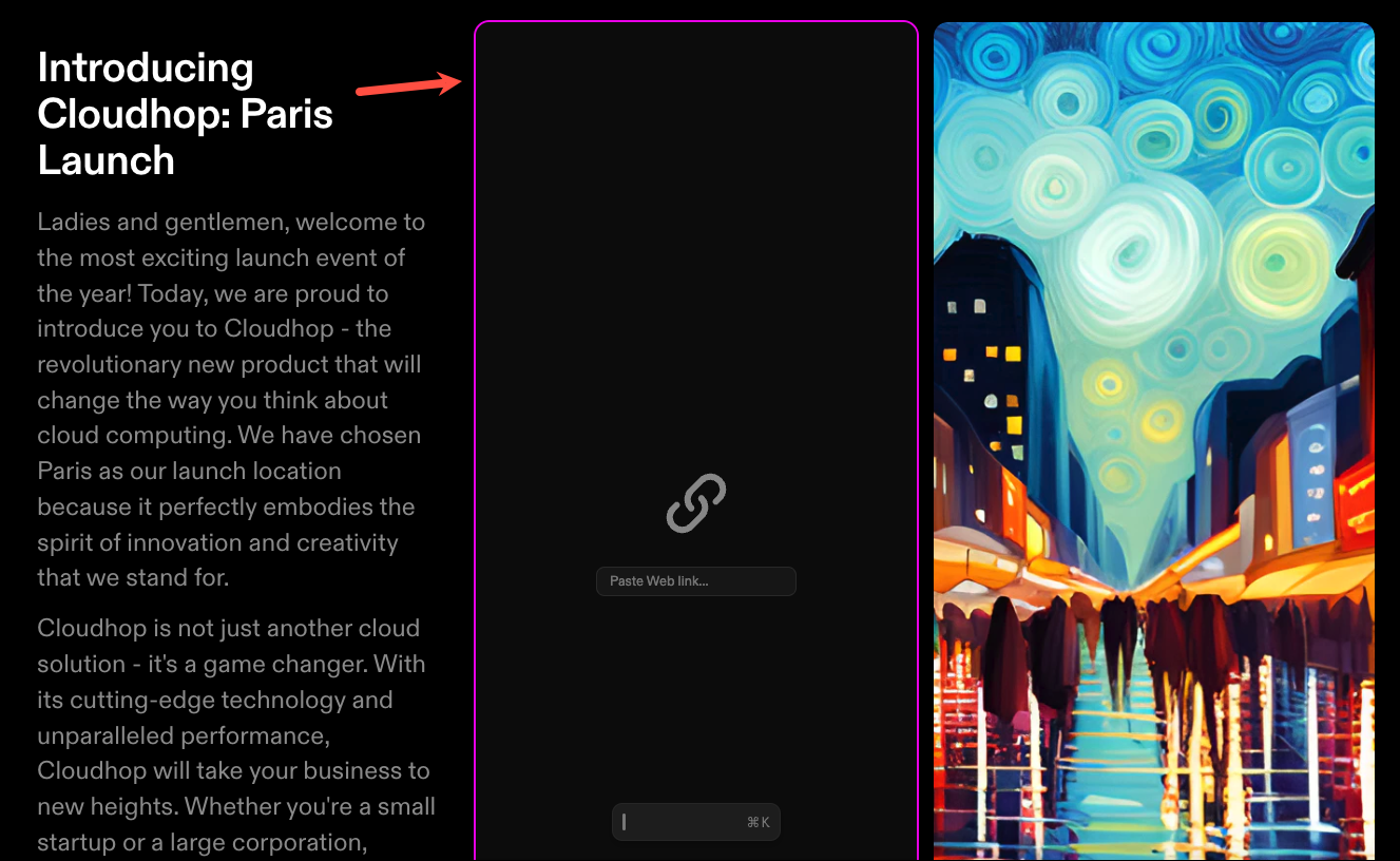 You can drag any tile of content on the page anywhere, and Tome will automatically handle the formatting. Hold and drag the tile; any place where you can drop the tile will be highlighted in pink; drag it onto the desired location.