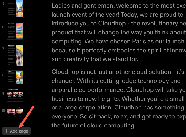 To add more pages to the presentation, you can click the 'Add page' button in the bottom left corner and then select the layout of the page you want to enter.