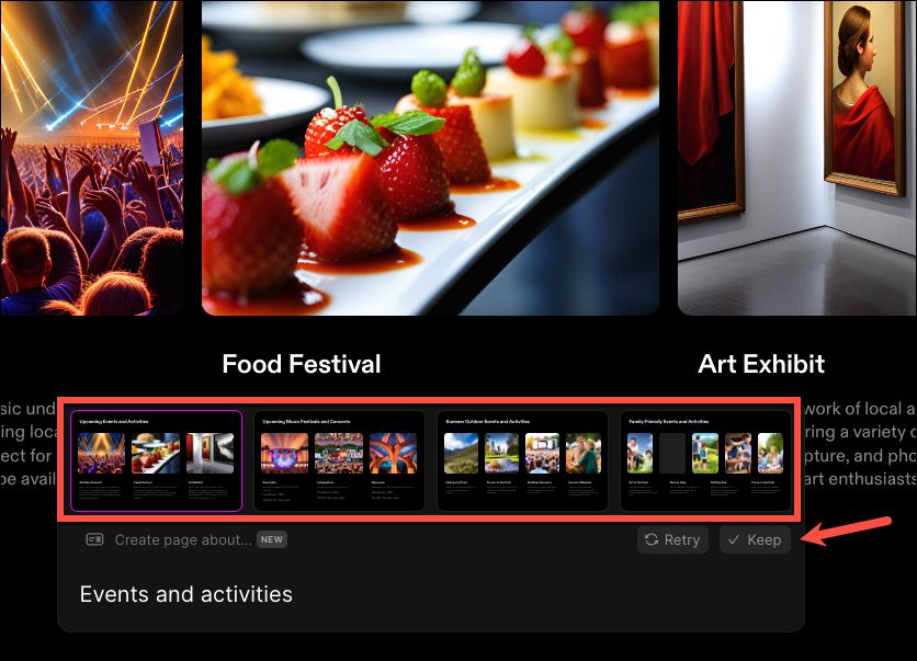 Tome AI will generate some sample pages. Select the one you want to keep and click the 'Keep' option. You can also ask the AI to regenerate the page samples, but it will count as an additional request to the AI and will cost you 5 credits.