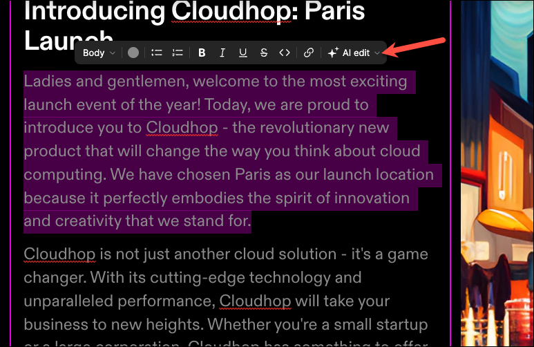 Tome AI can also help with editing written content. While you can't use it to generate written content separately, you can use it to edit the content that is already written – whether generated by Tome AI or written by you. Select the text you want to edit. Then, click on 'AI edit' from the hovering toolbar that appears.