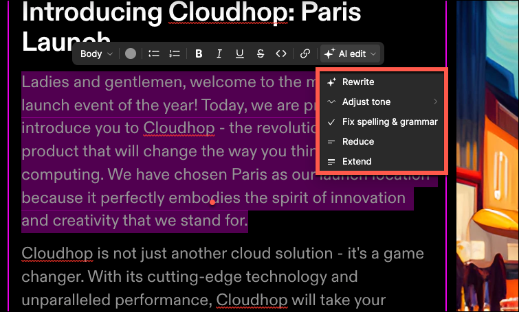Then, select what you want Tome AI to do – 'Rewrite', 'Adjust Tone', 'Fix spelling and grammar', 'Reduce' (shorten), or 'Extend' the text.
