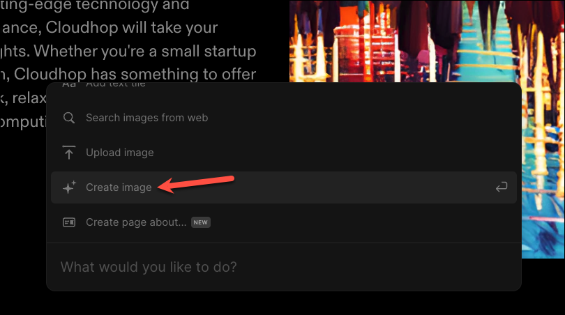 Moreover, you cannot only upload your own images or insert images from Unsplash on Tome for your presentations, but you can also ask the AI to generate an image for you as well. Tome uses Stable Diffusion to create images from prompts. The Tome AI can provide all-rounded help in creating presentations. Go to the prompt bar and select 'Create Image' from the options.