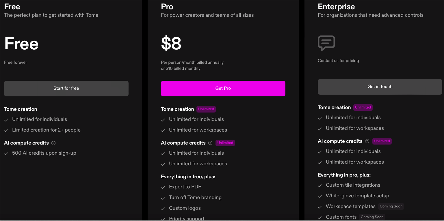 There are also Pro and Enterprise plans available. The Pro plan costs $10/person per month (or $8 when billed annually) and offers unlimited Tome and AI creations. It also includes other features such as no watermark, the option to import to PDF, custom logos, etc.