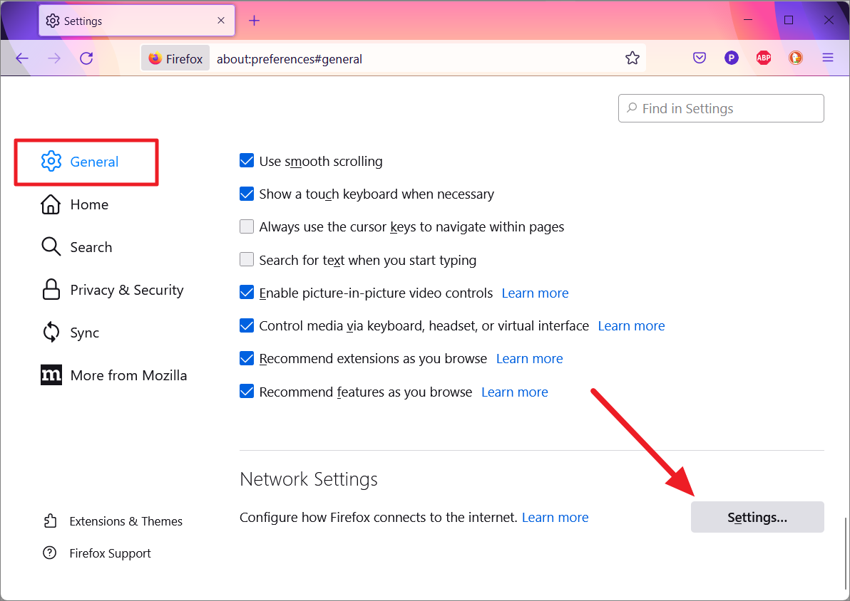 On the Settings page, go to the ‘General’ section, scroll down the right pane and click the ‘Settings’ button under the Network Settings section.