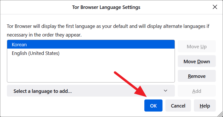 Tor will download the language and add it to the box if this is the first time you are adding it. Then, click ‘OK’.