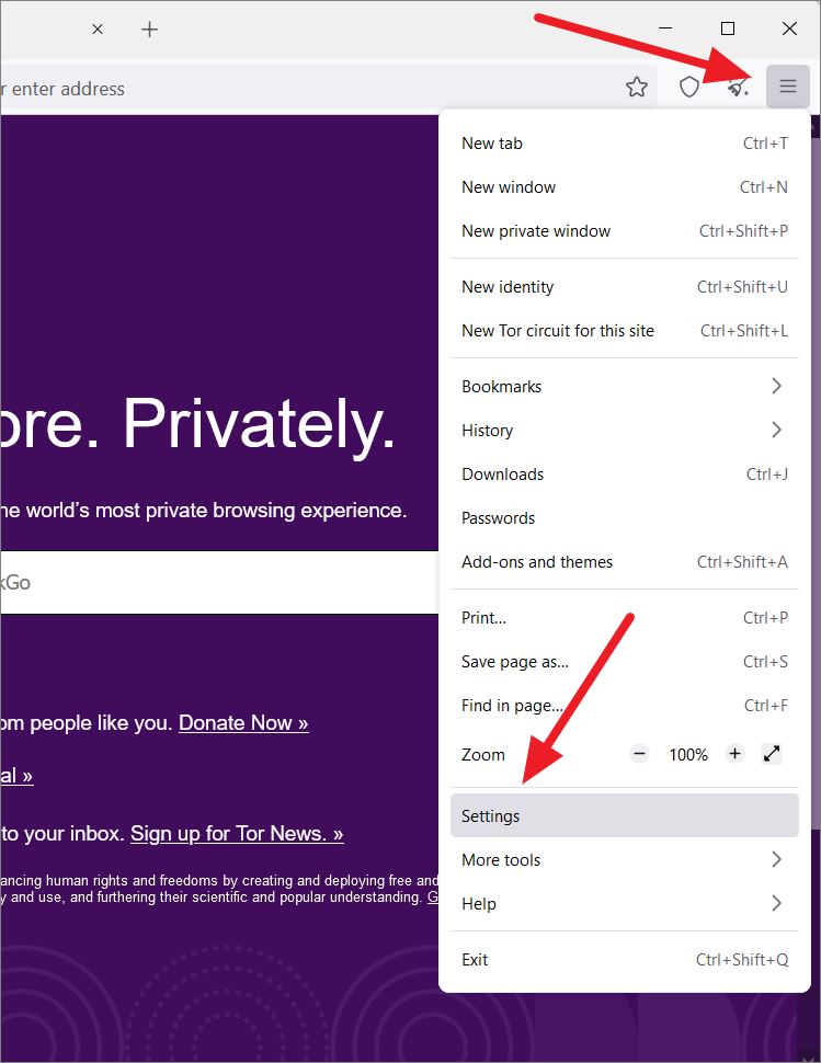 Open Tor settings by clicking the hamburger icon (three horizontal lines) at the top right corner and selecting ‘Settings’ from the menu that appears.