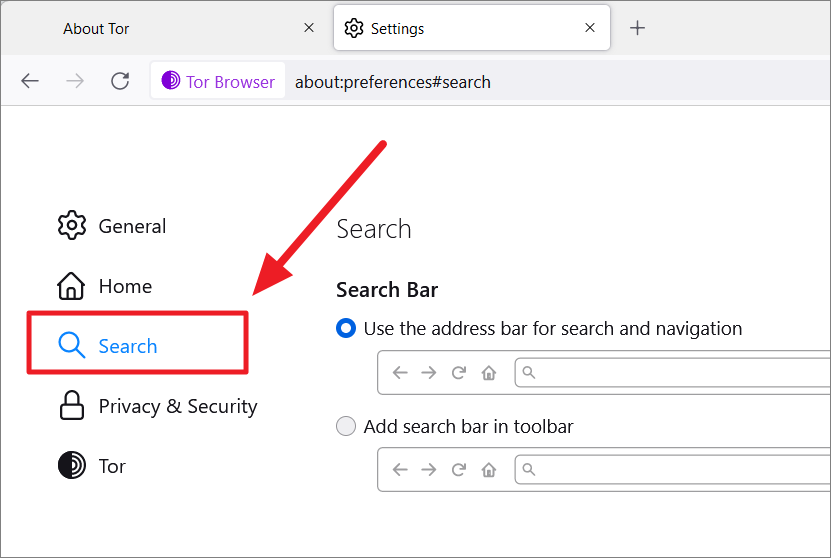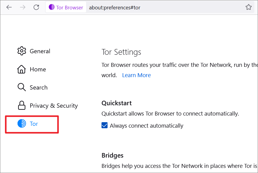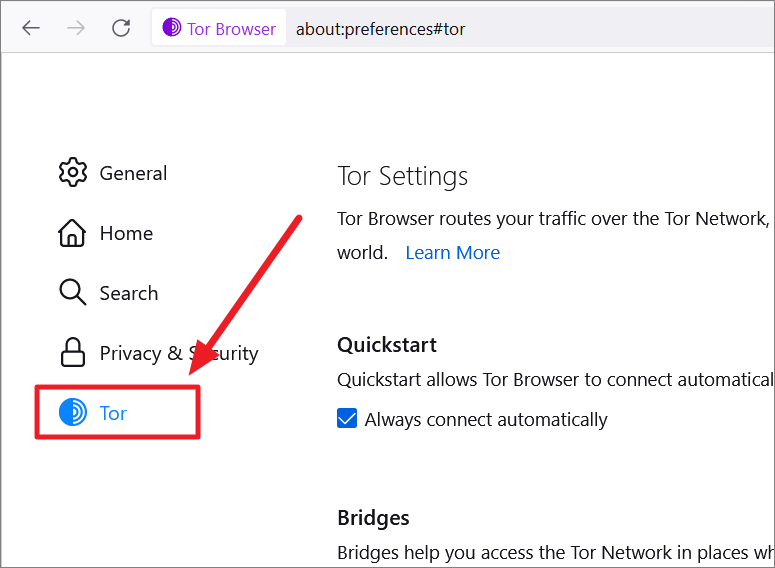 Open Tor browser settings and go to the ‘Tor’ section on the left sidebar.
