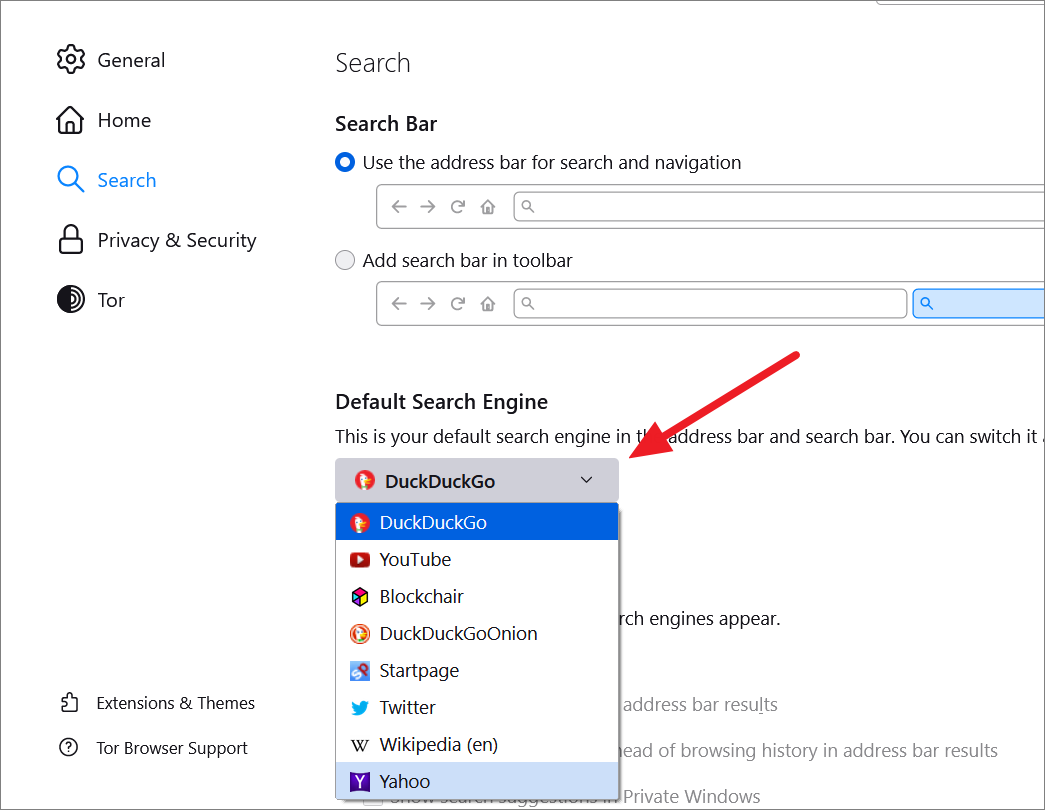 From the drop-down menu below Default Search Engine, choose a search engine you want to set as default in the address bar and search bar.