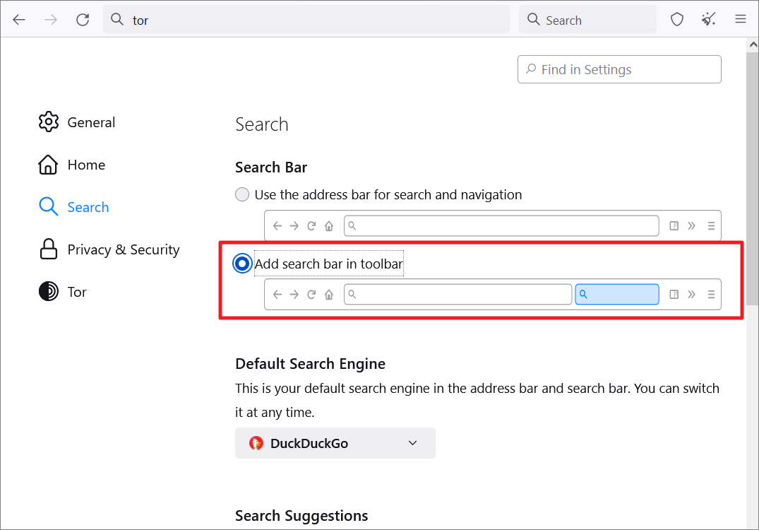 By default, the address bar is used for both searching the web and navigating the browser. However, if you want a separate search bar, select the ‘Add search bar in toolbar’ option.