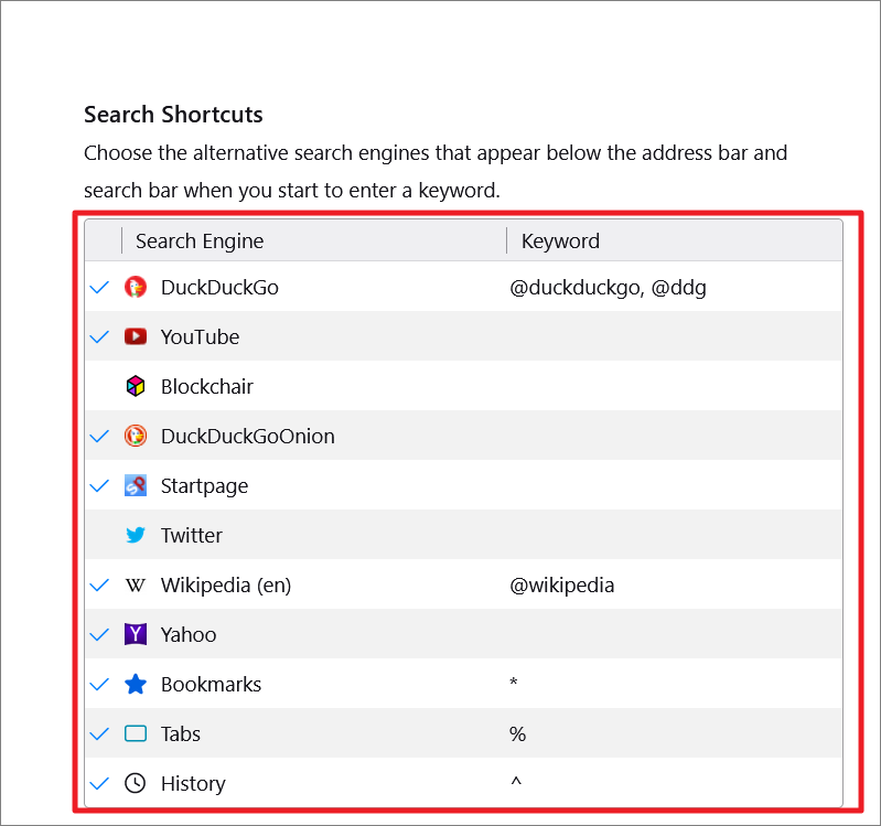 You can also choose which alternative search engines you want to appear below the address bar and search bar when you start typing. To do that, scroll down to the Search Shortcuts section and select the shortcuts you want to appear below the address bar.