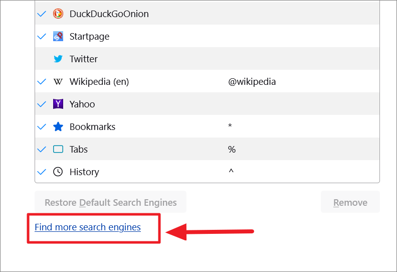 If the default engine is not available in the list of search engines, you can add it by clicking the ‘Find more search engines’ option.