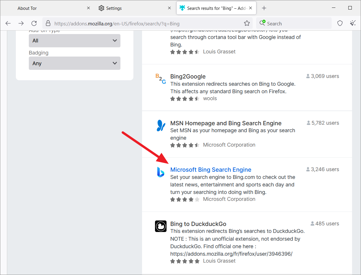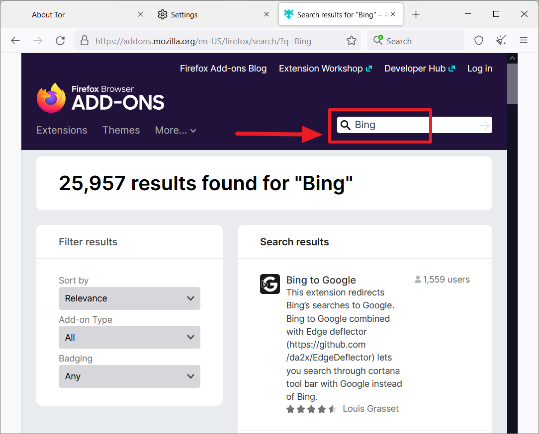 You can then look for search engine extensions using the search bar. Here we are searching for ‘Bing’. Since Tor is designed from firefox, you will actually be searching for addons in the Firefox Browser ADD-ONS webpage.
