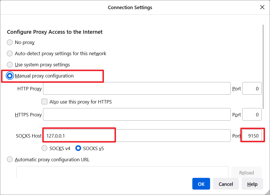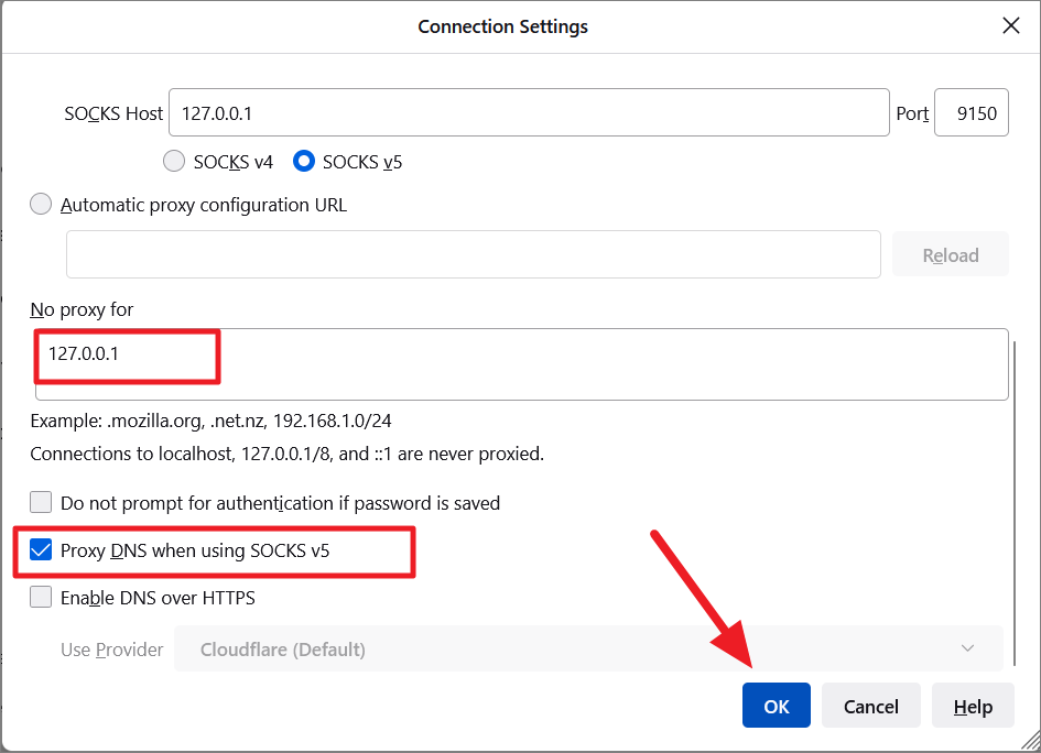 127.0.0.1in the ‘No proxy for’ field. - Select the ‘Proxy DNS when using SOCKS v5’ option.