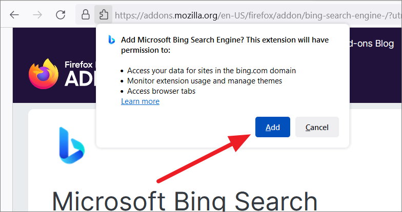 From the results, select the search engine you want to add (Microsoft Bing Search Engine).