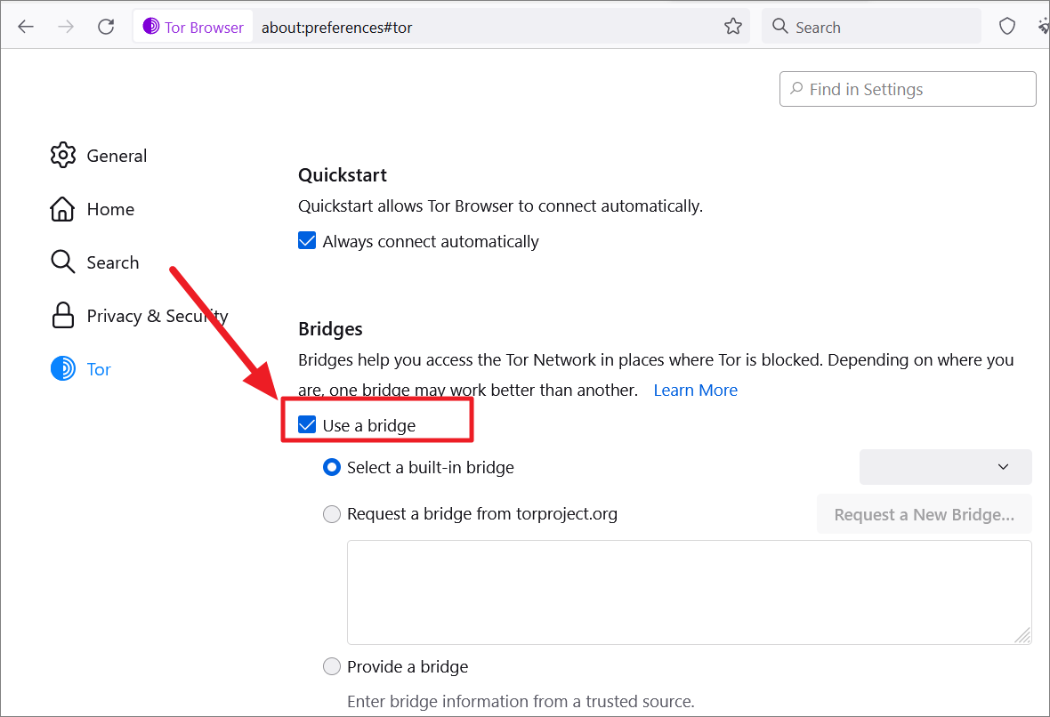 If Tor is blocked in your region or network, you can configure Proxy Bridges to access the Tor network. Bridges are relay nodes that are not publically listed, which means ISPs or governments cannot block them, at least not all of them. You can use built-in bridges or alternative bridges from the Tor official directory or you can also use custom bridges. Here’s how you can do this: