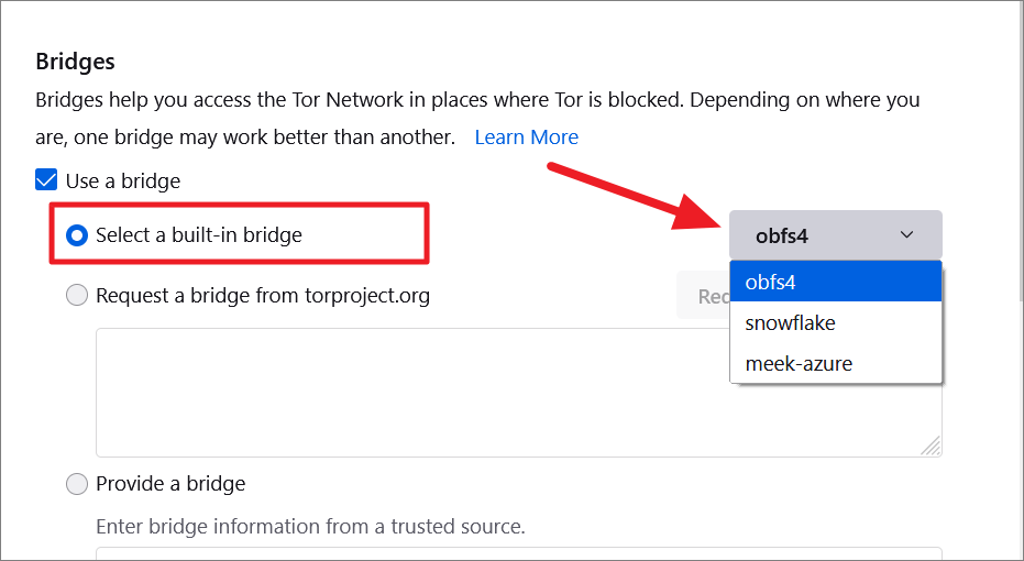 To use a built-in bridge, choose the Select a built-in bridge option and select one of the available bridges from the drop-down menu next to it.