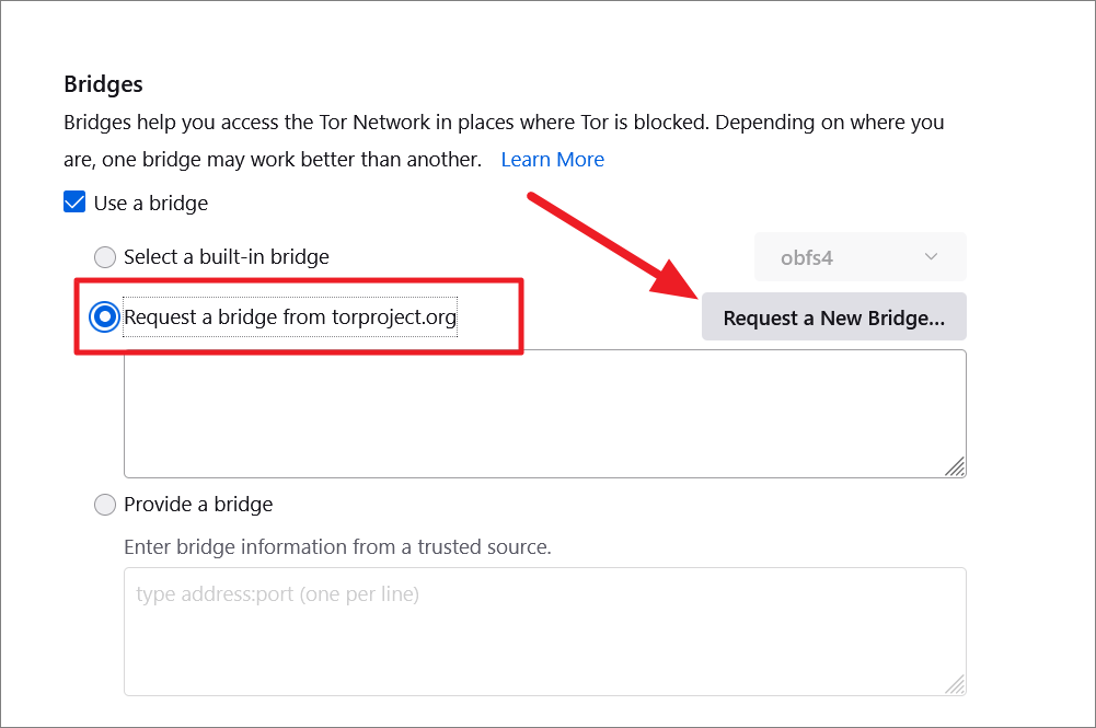 If the built-in bridge doesn’t work or you want to use a new bridge, you can choose the ‘Request a bridge from torproject.org’ option and click on the ‘Request a New Bridge’ button.