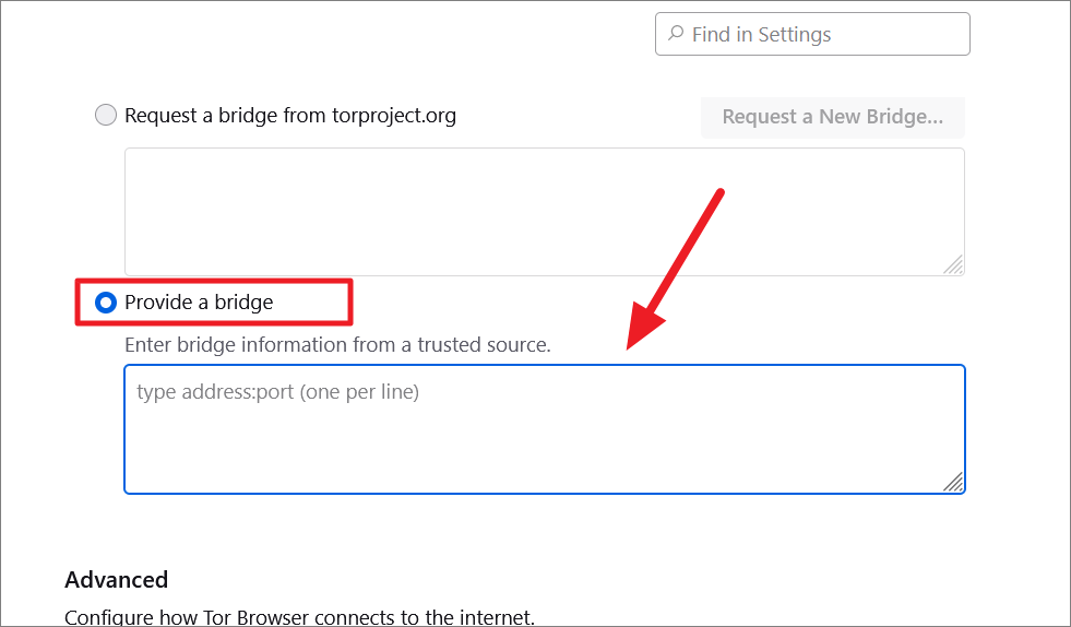 In case, you want to use a custom bridge, select the ‘Provide a bridge’ option and enter the bridge address and port (one per line) in the text field below.