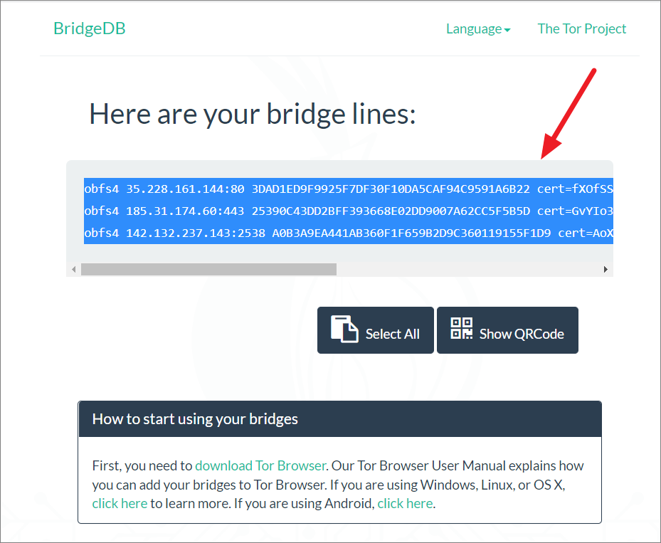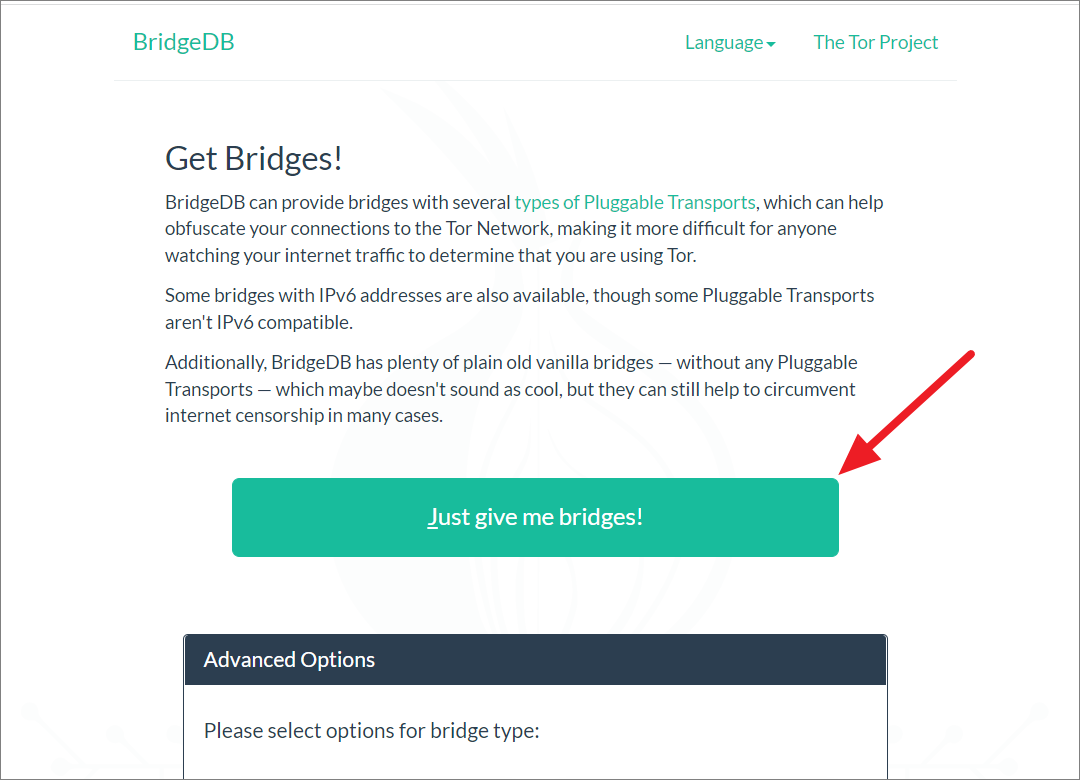 You can manually get bridges from Tor’s official bridge database by clicking the ‘Just give me bridges!’ button.
