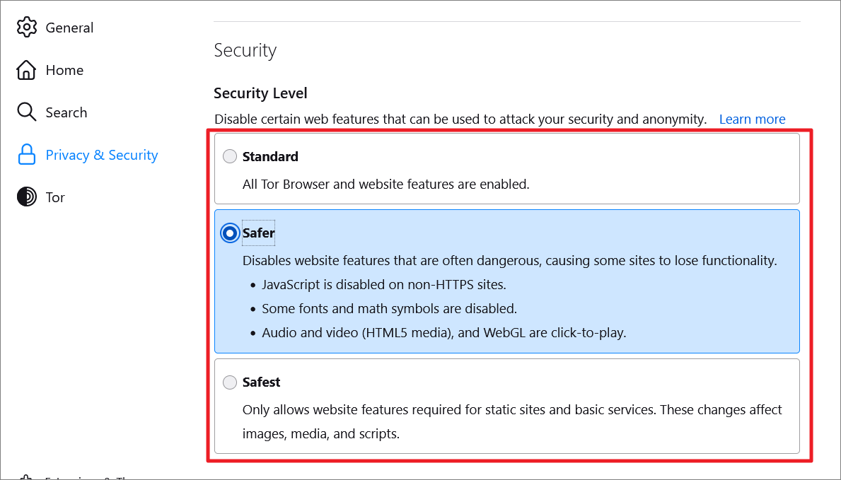 - Safest (High) – This is by far the highest level of security the Tor browser can offer. At this level, your privacy and security are the utmost priority of the browser. So, JavaScript is not allowed on all sites. Certain fonts, math symbols, and images are disabled. This level only allows website features necessary for static sites and basic services. And Audio and video (HTML5 media) and WebGL can only be allowed by clicking through the NoScript plug-in.