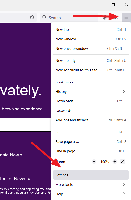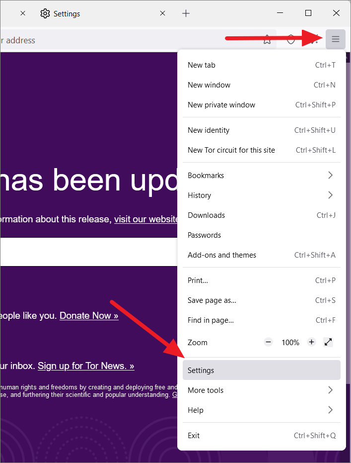 Launch the Tor browser, and click the hamburger icon (three horizontal lines) at the top right corner. Then, select ‘Settings’ from the menu that appears.