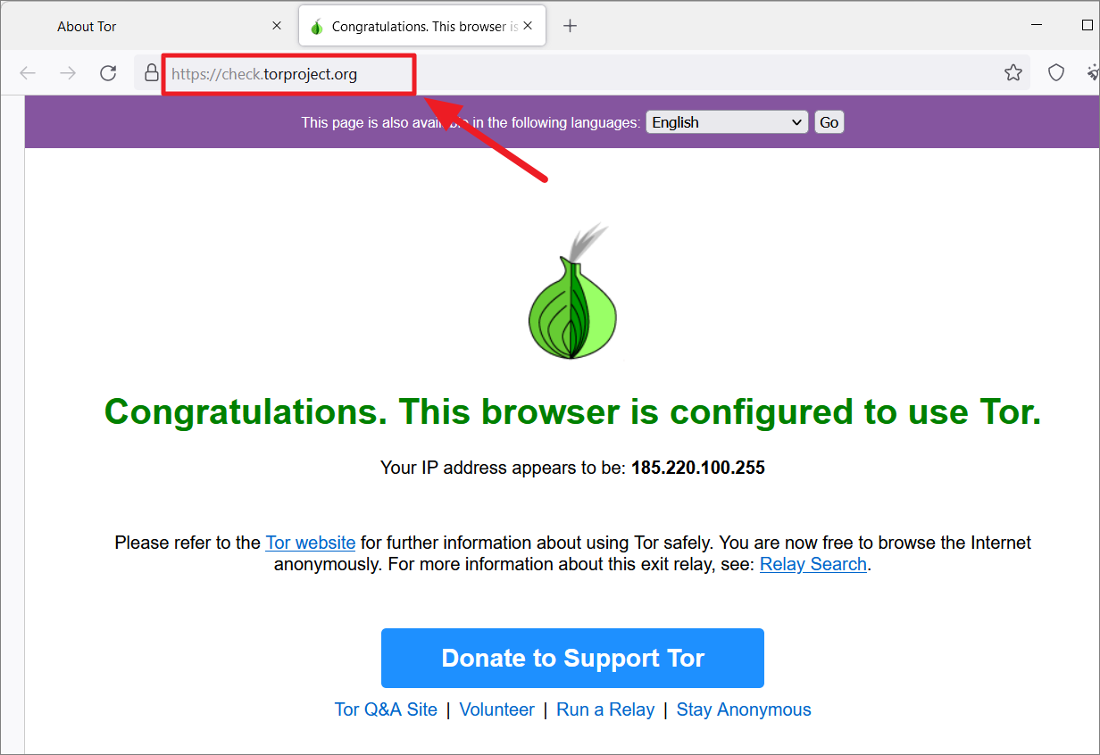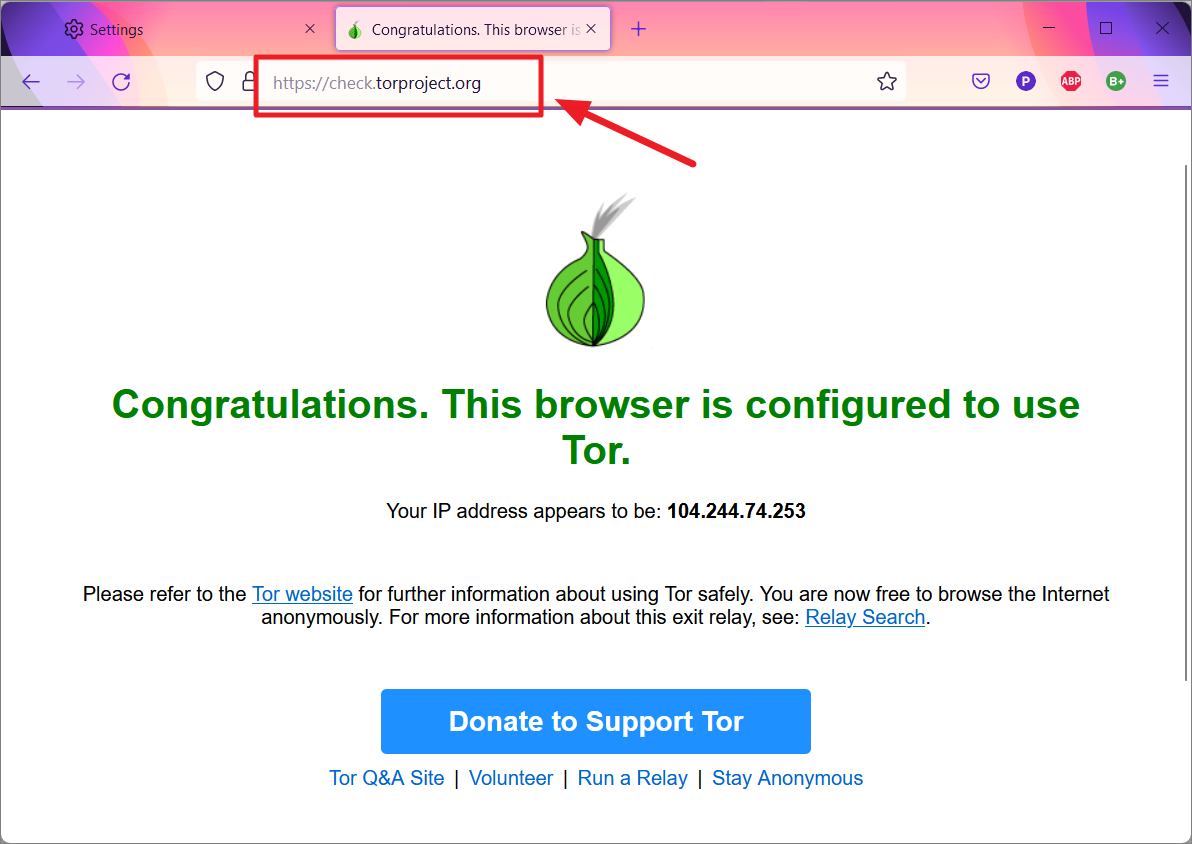 To check if the Firefox browser is connected to the Tor network, type check.torproject.org in the address bar and hit Enter.