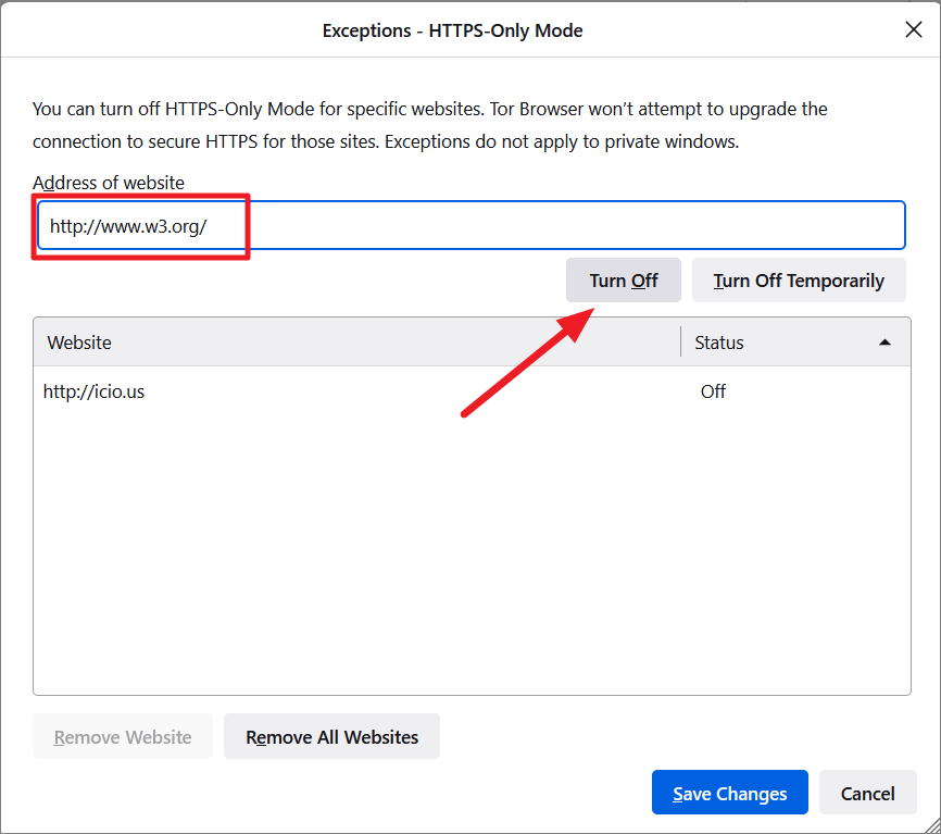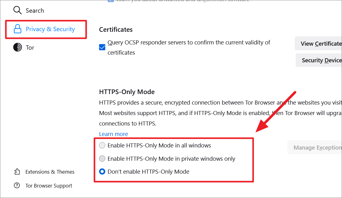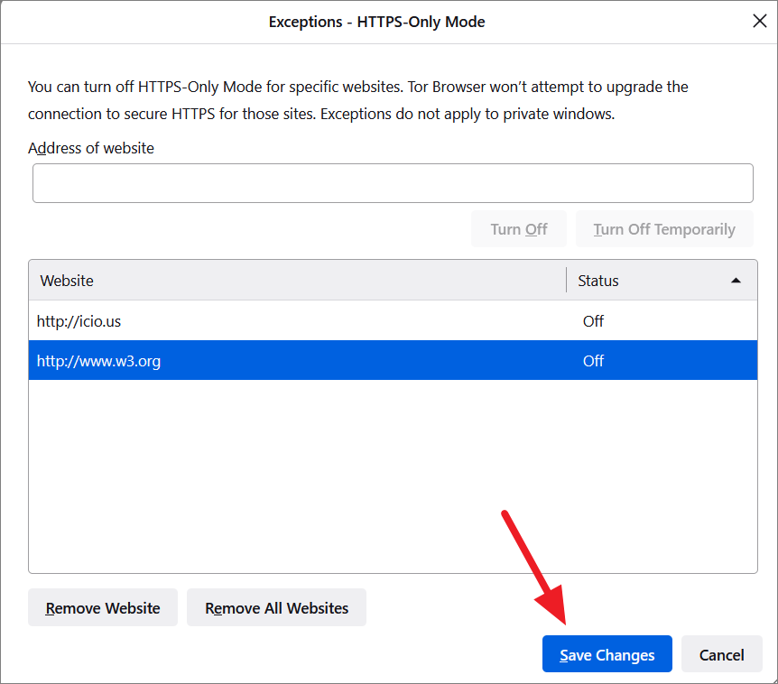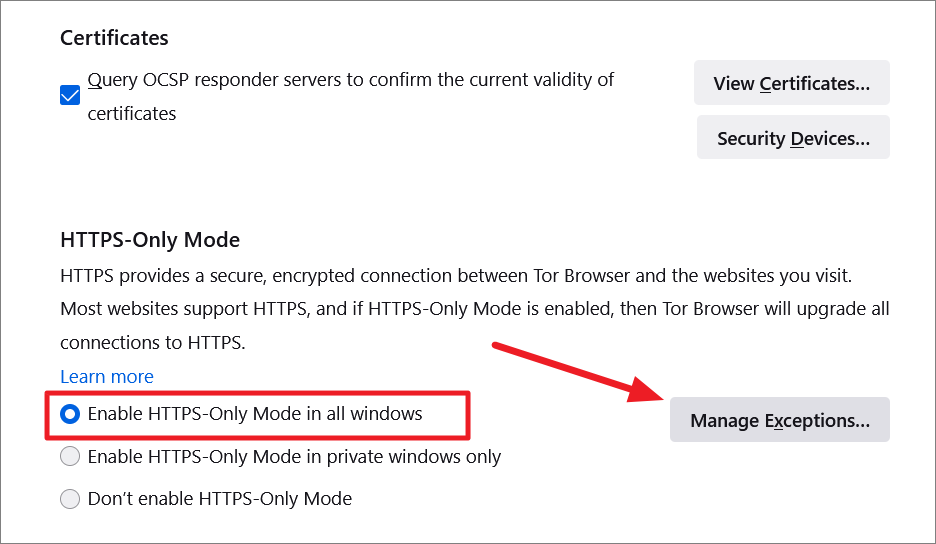 If you selected ‘Enable HTTPS-Only Mode in all windows’, you can also add exceptions by clicking ‘Manage Exceptions…’. Tor Browser won’t block these sites even if they don’t support HTTPS.