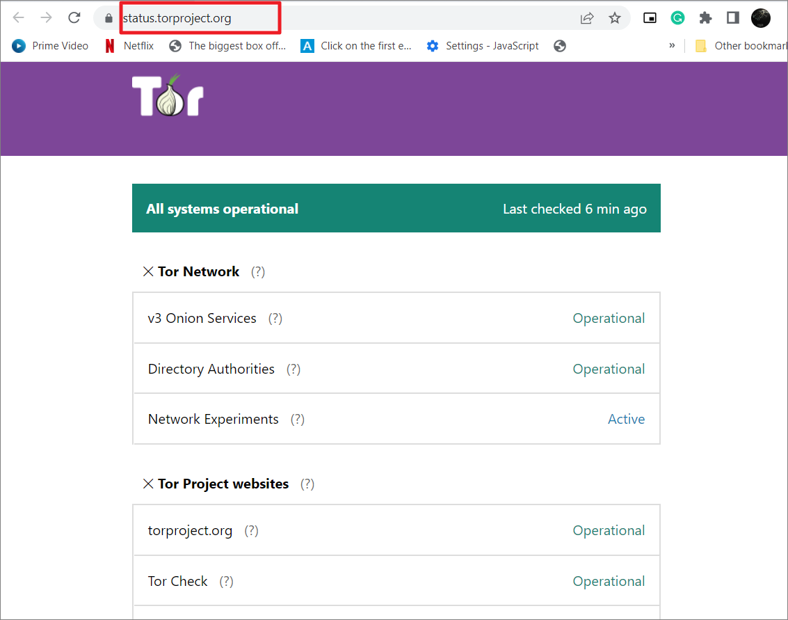 Visit the Tor Project Status website on any browser and see if all systems are running.