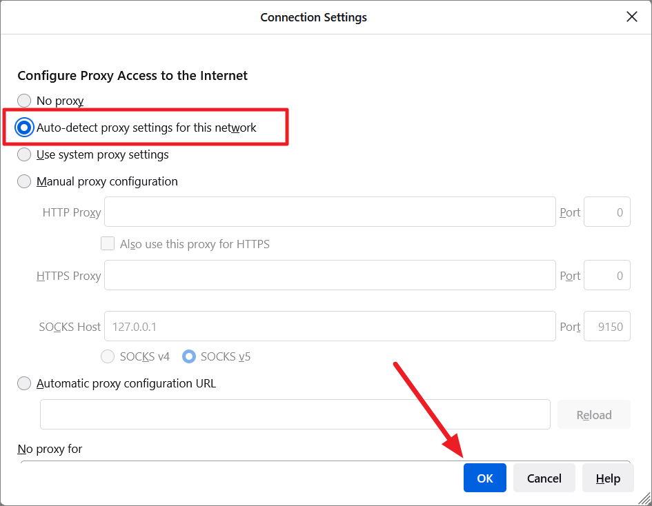 To disconnect from the tor network, go back to the Connection Settings, select the ‘Auto-detect proxy settings for this network’ option, and click ‘OK’.