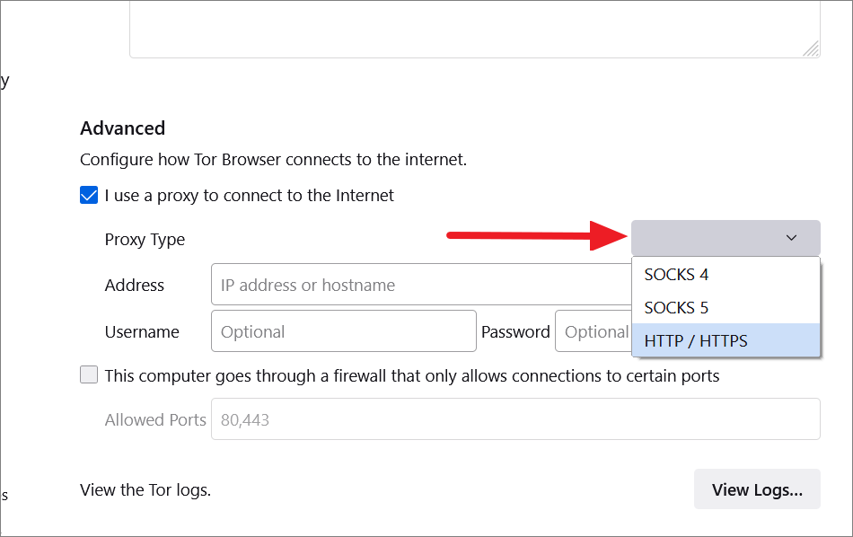 After that, choose the proxy protocol you want to use for connection from the ‘Proxy Type’ drop-down menu. Usually, most services use the ‘HTTP/HTTPS’ protocol.