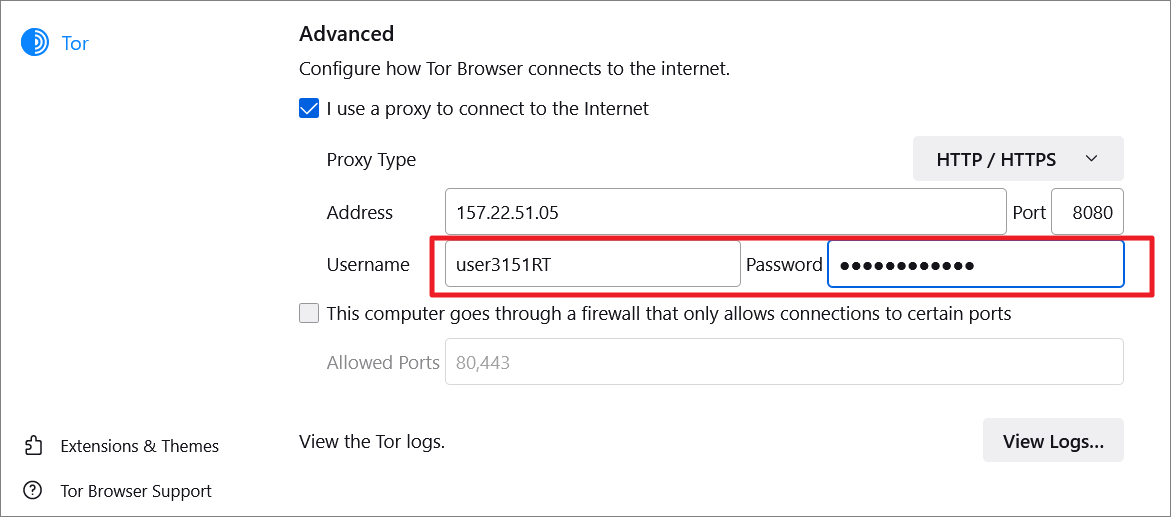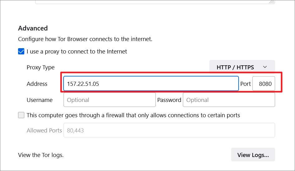 Now, type the proxy IP address and port number you got from the proxy service provider in the ‘Address’ and ‘Port’ fields.