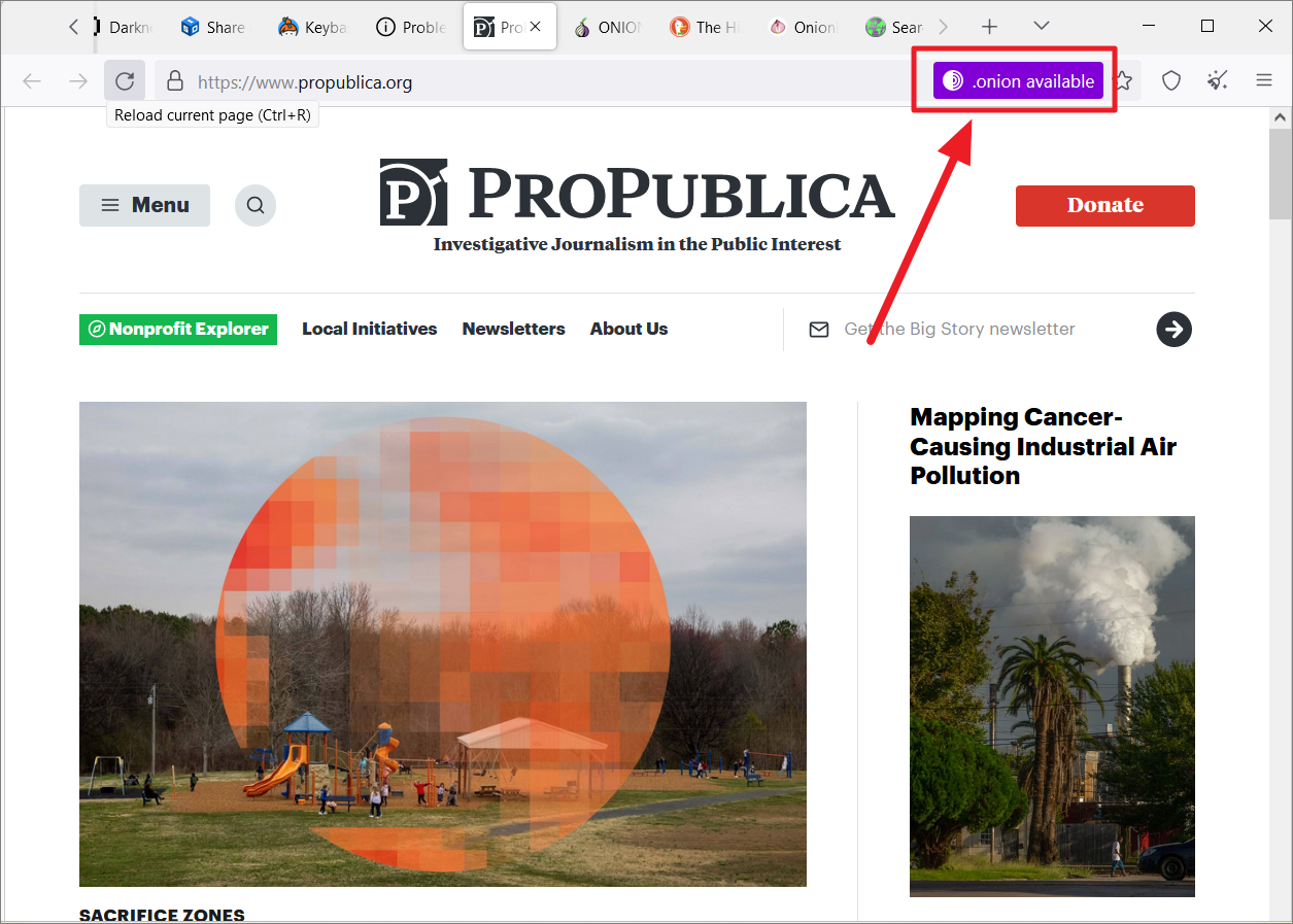 If a website you are visiting on the Tor browser has an onion site, you will see a purple button called (.onion available) at the right corner of the URL bar.