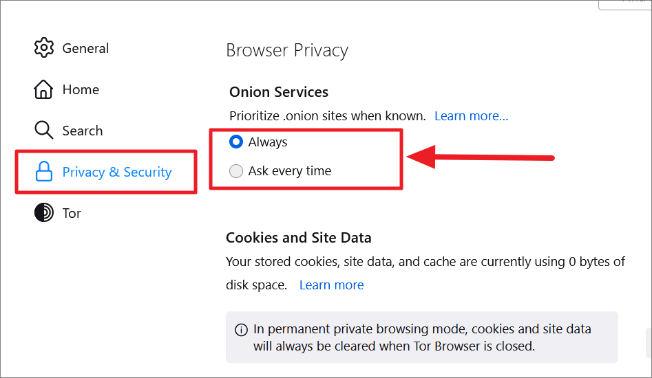 To do that, open Tor Settings, and click on ‘Privacy & Security’ on the left panel. On the right, you will see two options under Online Services: ‘Always’ and ‘Ask every time’.
