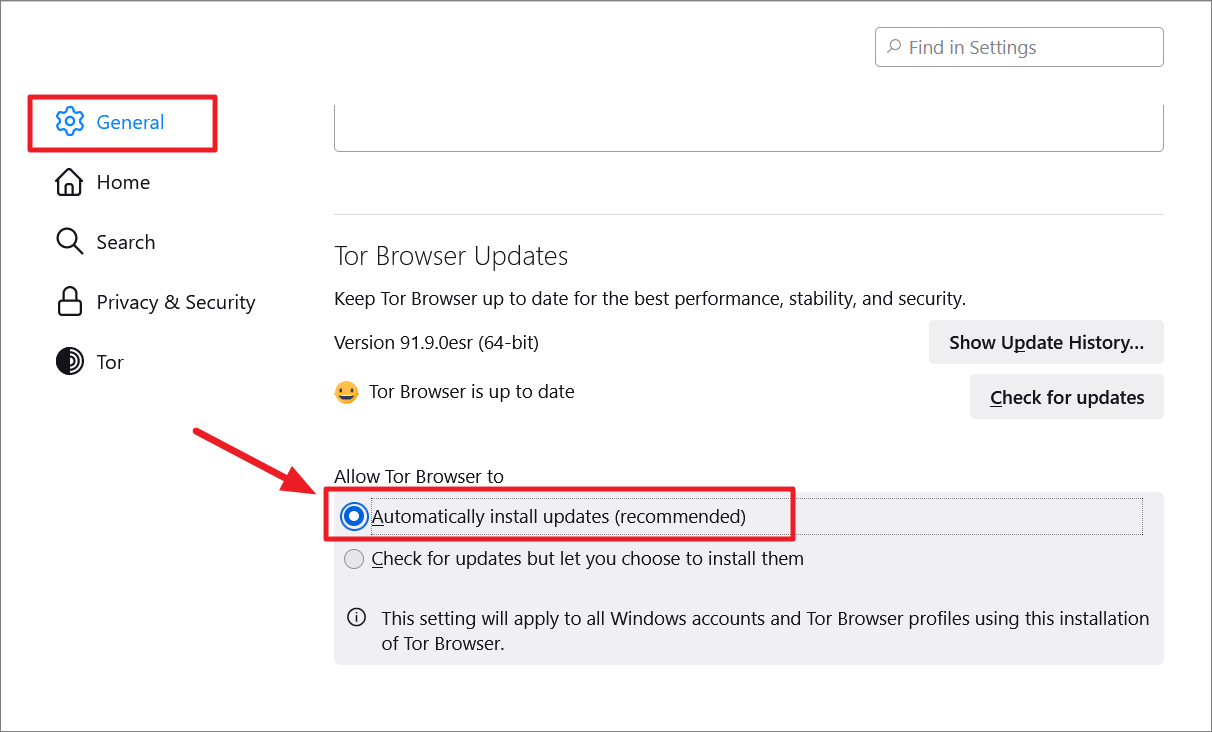 In the Tor settings, go to the ‘General’ section, and scroll down to the ‘Tor Browser Updates’ section on the right. Then, make sure the ‘Automatically install updates (recommended)’ option is selected.