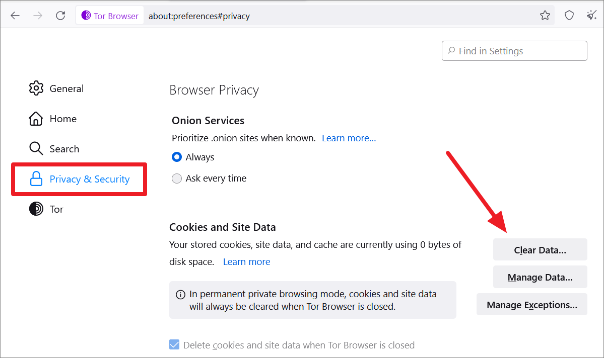 Although Tor hides your identity and prevents websites from storing cookies and site data, some websites still find a way to store data about you and your activities. So, it’s best to clear your cookies and site data after every session.