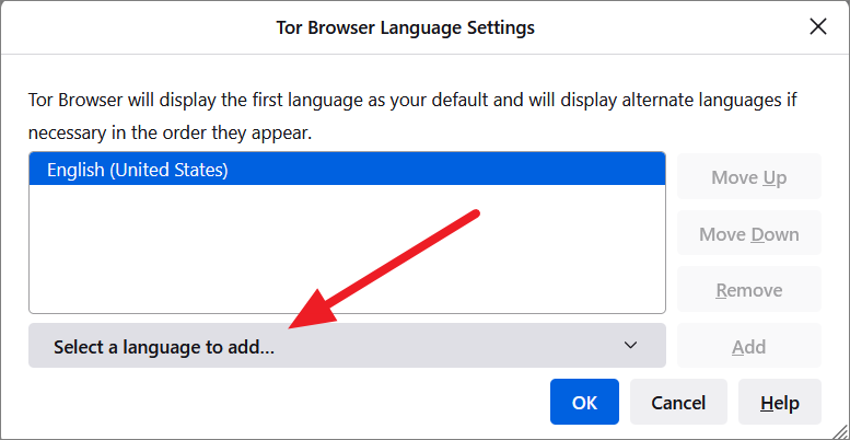 In the Tor Browser Language Settings dialog box, click the ‘Select a Language to add…’ drop-down menu at the bottom.