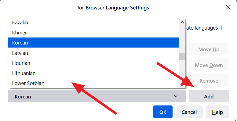 Then, select the language you want to use for the Tor browser from the list and click the ‘Add’ button.