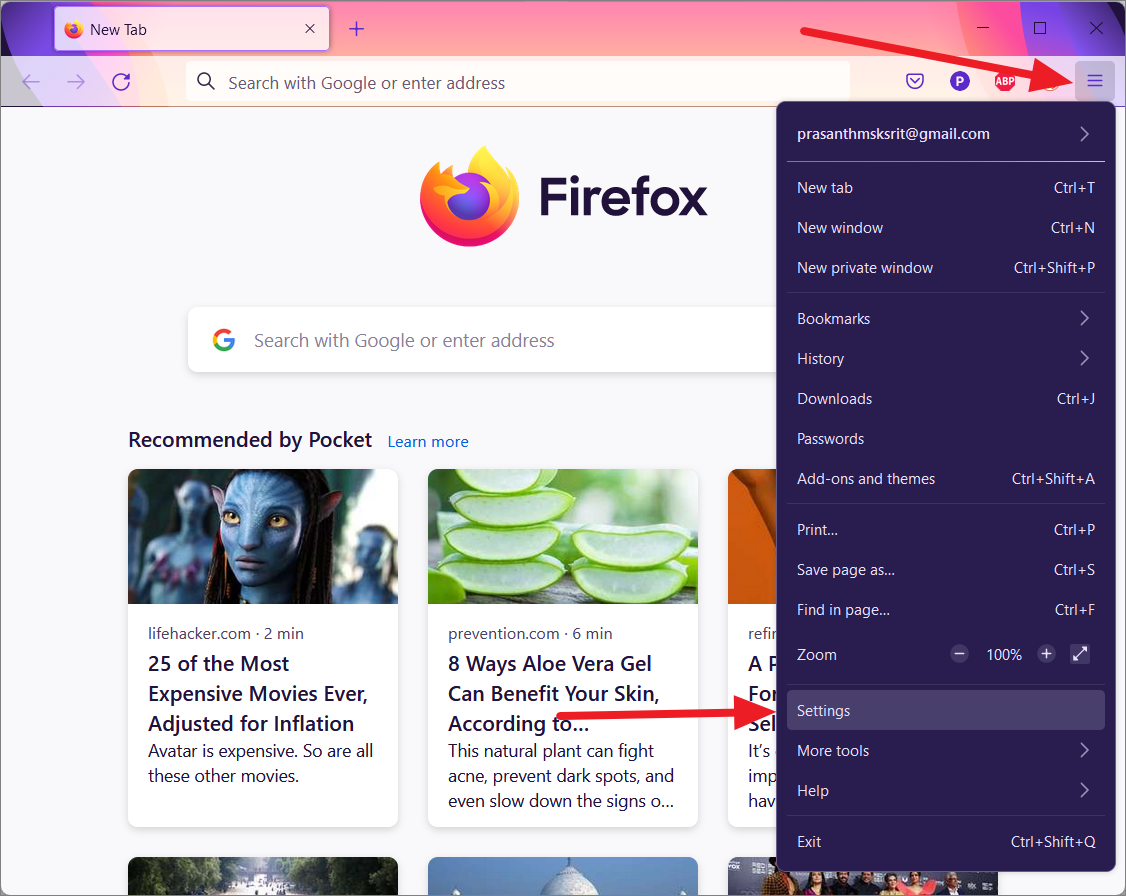First, open the Firefox browser, and click the hamburger button (Menu) at the top right corner. Then, select the ‘Settings’ option from the menu.