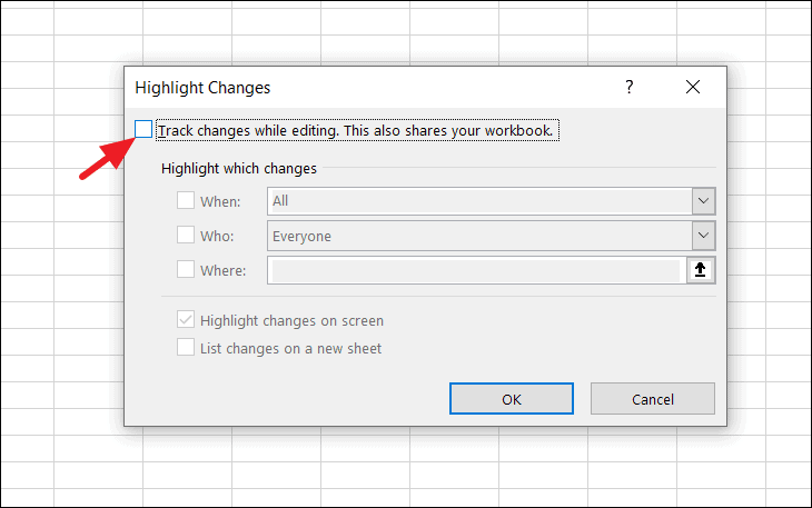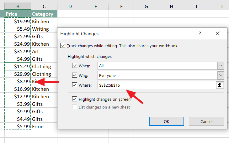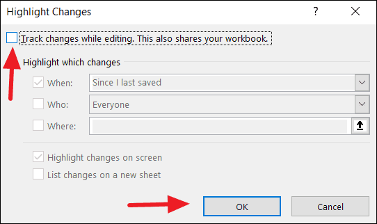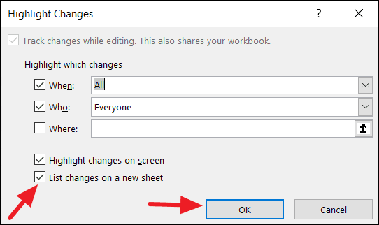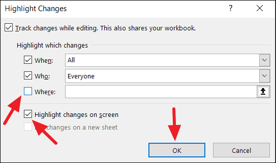 Note: If you prefer to track changes in a specific range of cells, enter the desired cell range in the Where field before clicking OK.