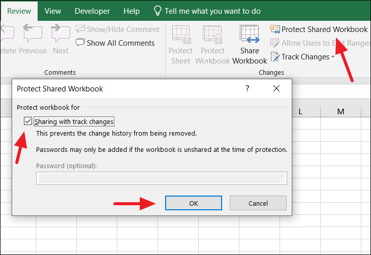 Step 9: Still on the Review tab, click on Protect Shared Workbook. In the dialog box that appears, check the option Sharing with track changes to prevent others from disabling the tracking. Click OK to proceed.