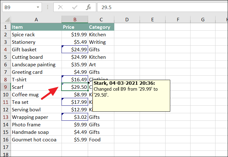 Changes made to the worksheet are indicated by a colored border around the modified cells and a small triangle in the upper-left corner of each cell.