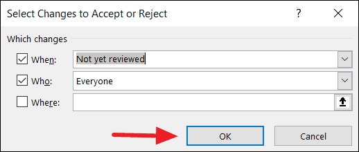 Step 2: In the Select Changes to Accept or Reject dialog box, specify the changes you want to review, or simply click OK to view all changes.
